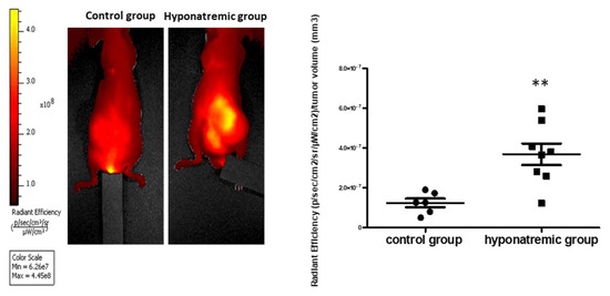 In agreement with previous in vitro findings [10,11], we found that the growth of tumoral lesions was significantly greater in hyponatremic animals. The different growth vs. normonatremic mice was observed starting from a few days after the induction of hyponatremia and was maintained until the end of the experimental protocol. In addition to tumor size and weight, differences among the groups were also clearly visualized using the IVIS Lumina 5 System, which is based on bioluminescence emission.