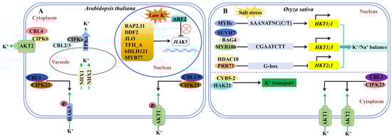 A schematic diagram of the regulatory pathways of K+ channels or transporters in Arabidopsis and rice. (A,B) Transcriptional regulation and post-translational regulation pathways of K+ channels or transporters in Arabidopsis (A) or rice (B). “→” indicates promoting effects. “⟂” indicates an inhibitory effect.