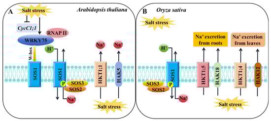 In addition, other K+ channels and transporters are involved in the regulation of Na+/K+ homeostasis under salt stress (Figure 3): OsKAT1 overexpression improves rice salt tolerance by increasing intracellular K+ content []. The vacuolar Na+/H+ antiporter NHX family genes play an important role in plant salt stress response. Under high-salt conditions, AtNHX1 overexpression plants have a stronger ability to maintain intracellular K+ homeostasis, thereby improving salt tolerance []. Under salt stress, K+ accumulation decreased and Na+ content increased in the leaves of nhx1 nhx2 mutants, indicating that AtNHX1 and AtNHX2 may be involved in the maintenance of Na+/K+ homeostasis []. In addition, the nhx5 nhx6 mutant was also sensitive to salt stress []. AtNHX7/AtSOS1 located on the plasma membrane is regulated by the phosphorylation of the upstream AtSOS2–AtSOS3 complex [] and actively transports Na+ to expel Na+ from the roots []. Under high-salt conditions, the expression of AtCycC1;1 was inhibited, while the expression of AtWRKY75 was activated, resulting in increased recruitment of the AtSOS1 promoter by RNAP II, which promoted the expression of AtSOS1 and enhanced salt tolerance [] (Figure 3A). OsNHX1 and OsNHX2 are induced by salt stress in rice, and the accumulation of Na+ and K+ in the cytoplasm is regulated by vacuolar compartmentation. Overexpression of OsNHX1 significantly improves the salt tolerance of rice [,]. In rice, OsSOS3 also interacts with OsSOS2 and phosphorylates the OsSOS2 protein, thereby activating OsSOS1 on the plasma membrane, resulting in Na+ efflux from cells and maintaining the Na+/K+ balance in cells [] (Figure 3B).