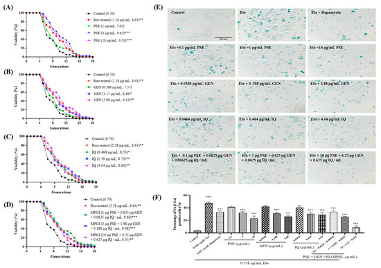 Aging and MASLD involve many common disease factors and mechanisms, such as inflammation, autophagy, and metabolic syndrome [2,22]. Therefore, the antiaging activities of PSE, GEN, and IQ alone and their combination in yeast and PC12 cells were determined. The results of the replicative lifespan assay of K6001 yeast are shown in Figure 1A–D. PSE, GEN, and IQ significantly extended the replicative lifespan of K6001 yeast at concentrations of 3 and 10 μg/mL (Figure 1A; p < 0.001 and p < 0.001 respectively), 1.17 and 3.88 μg/mL (Figure 1B; p < 0.05 and p < 0.01, respectively), and 1.39 and 4.64 μg/mL (Figure 1C; p < 0.01 and p < 0.01, respectively). In addition, MPGI significantly extended the replicative lifespan of K6001 yeast at concentrations of 1 μg/mL PSE + 0.625 μg/mL GEN + 0.0625 μg/mL IQ and 3 μg/mL PSE + 1.88 μg/mL GEN + 0.188 μg/mL IQ (Figure 1D; p < 0.001, p < 0.001, and p < 0.01, respectively). The average generation of a dose of the mixture with a low concentration was higher than that of the three components acting alone (Figure 1A–D). These results suggested that MPGI, PSE, GEN, and IQ have antiaging effects on yeast. Meanwhile, Etoposide (Eto) was used to induce senescence in PC12 cells, and the antiaging effects of PSE, GEN, IQ, and MPGI were examined using the SA β-Gal kit to determine whether they have the same antiaging effect on mammal cells. As expected, SA β-Gal-positive cells in the Eto group obviously increased (Figure 1E,F; p < 0.001), whereas those in the PSE, GEN, IQ, and MPGI groups significantly decreased (Figure 1E,F; p < 0.001 for PSE; p < 0.001 for GEN; p < 0.001 for IQ; p < 0.001 for MPGI). The percentages of senescence cells in the negative control and Eto groups were 3.82% and 47.68%, respectively. Meanwhile, the number of SA β-Gal-positive cells decreased in a dose-dependent manner when adding different concentrations of PSE, GEN, IQ, and MPGI (Figure 1E,F; p < 0.001, p < 0.001, p < 0.001, p < 0.001, p < 0.001, p < 0.001, p < 0.001, p < 0.001, and p < 0.001). These results indicated that PSE, GEN, IQ, and MPGI had the same antiaging effect on yeast and mammal cells, for which MPGI demonstrated the best effect.