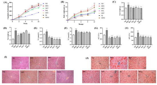 Next, given the antiaging activities of PSE, GEN, and IQ and the many common disease factors and mechanisms involved in aging and MASLD, MPGI’s ability to improve hepatic steatosis in high-fat diet (HFD)-fed mice was evaluated. The food intake and body weight of the HFD group significantly increased compared with those of the normal control group (Figure 2A,B; p < 0.001 and p < 0.001). After 140 mg/kg metformin (MET), 80 mg/kg PSE, 50 mg/kg GEN, or 5 mg/kg IQ or MPGI was administered for 12 weeks, and the food intake of all the treatment groups obviously decreased at 3, 6, 9, and 12 weeks compared with that of the HFD group (Figure 2A; p < 0.001, p < 0.001, p < 0.001, and p < 0.001, respectively). The significant increase in body weight induced by HFD in the MET, PSE, and MPGI groups remarkably recovered to normal level (Figure 2B, p < 0.01, p < 0.05, p < 0.01). However, these effects on food intake and body weight were not observed in the GEN and IQ groups (Figure 2A,B). Except for the fat weight in the GEN and IQ groups, the fat and liver weights in all other treatment groups significantly decreased compared with those in the HFD group (Figure 2C: p < 0.01, p < 0.001, p < 0.05, p < 0.01, and p < 0.001, respectively; Figure 2D: p < 0.001, p < 0.05, and p < 0.05, respectively). Meanwhile, the blood biochemical indicators of mice were recorded. The plasma TG, TC, ALT, and AST of the HFD group significantly increased compared with those of the normal group, whereas those of the MET, GEN, and MPGI groups significantly decreased (Figure 2E–H; p < 0.001, p < 0.05, p < 0.001, and p < 0.001, respectively). Furthermore, H&E staining and oil red O staining were applied to detect any pathological changes in the mouse livers. In the HFD group, significant vacuolar degeneration and fat accumulation were observed. After treatment with MET, PSE, GEN, IQ, and MPGI, these pathological changes in the MET and MPGI groups demonstrated a unique improvement (Figure 2I,J). The results suggested that MPGI improved the hepatic steatosis of mice induced by HFD, and the effect of MPGI was equivalent to that of MET.