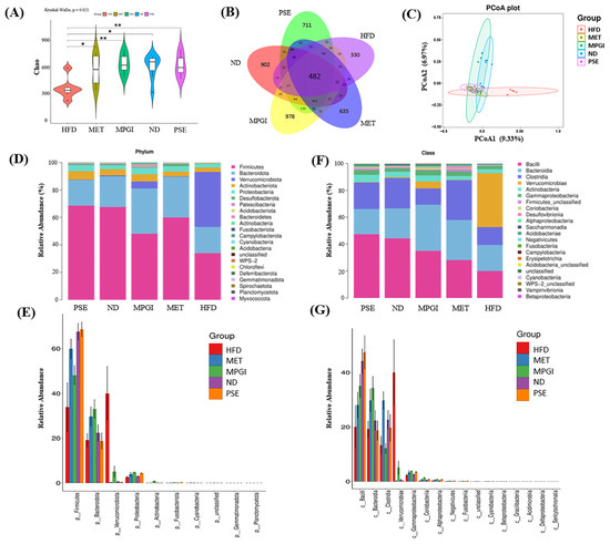Fresh fecal samples from each mouse collected during week 8 of the animal experiment were used for gut microbiota analysis. These samples, from eight mice in the ND, HFD, MET, PSE, and MPGI groups, were randomly selected for analysis. Firstly, the total genomic DNA was extracted using the TIANamp Bacterial DNA kit, followed by amplification of the V4 regions of the 16S rRNA gene by using composite sense and anti-sense primers under appropriate PCR conditions. Afterwards, the broken sticky end of the target amplicon fragment was repaired using Klenow DNA polymerase, T4 DNA polymerase, and T4 PNK. Magnetic beads were then utilized to purify the amplicons, which were pooled after replication. Subsequently, the sequences were analyzed using the DAD2 method (Benjamin J Callahan, Stanford University, USA), and amplicon sequence variants (ASVs) were assigned to each representative sequence. The analysis was carried out by LC-Bio Technology Co., Ltd., Hangzhou, China.