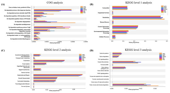 The function prediction of gut microbiota in mice with MASLD after treatment with MPGI. The results of COG analysis (A), KEGG analysis at level 1 (B), KEGG analysis at level 2 (C), and KEGG analysis at level 3 (D).
