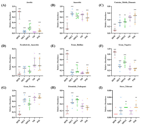 Meanwhile, bacterial phenotypic prediction of the gut microbiota was performed. A reduction in bacteria that contain mobile elements and anaerobic, facultatively_anaerobic, and Gram_positive bacteria (Figure 5B, p < 0.001; Figure 5C, p < 0.001; Figure 5D, p < 0.001; Figure 5G, p < 0.001) and an increase in bacteria that forms biofilms and aerobic and Gram_negative bacteria (Figure 5A, p < 0.001; Figure 5E, p < 0.001; Figure 5F, p < 0.001) were observed in the HFD group compared with the normal control. Since the Verrucomicrobiota in the HFD group was considered to be beneficial microflora, the Potentially_Pathogentic bacteria in the MET and MPGI groups were higher than that of the HFD group (Figure 5H; p < 0.001 and p < 0.001, respectively). These parameters returned to normal levels in the MET, PSE, and MPGI groups (Figure 5A–I). These results confirmed that the microbiome–gut–liver axis is involved in the protective effect of MPGI for the liver.