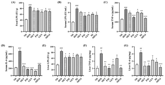 MPGI mitigates inflammation in MASLD mice. Changes in fecal LPS (A), serum LPS (B), serum TNF-α (C), serum IL-6 (D), LPS in liver (E), TNF-α in liver (F), and IL-6 in liver (G). The number of samples in each group is six. The data are presented as mean ± SEM. ## and ### indicate significant difference at p < 0.01 and p < 0.001 compared with the ND group; *, **, and *** indicate significant difference at p < 0.05, p < 0.01, and p < 0.001 compared with the HFD group.
