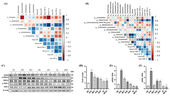 Correlation between gut microbiota and inflammation factors, and the effect of MPGI on the TLR4/NF-κB signaling pathway in the liver of mice with MASLD. Correlation between gut microbiota and inflammation factors at phylum level (A) and genus level (B). Western blot analysis of liver TLR4, pIKK β, IKK β, pIκB α, and IκB α (C). ND group, 1–2 wells; HFD group, 3–4 wells; MET group, 5–6 wells; PSE group, 7–8 wells; GEN group, 9–10 wells; IQ group, 11–12 wells; MPGI group, 13–14 wells. Each sample is a mixture of three independent mouse livers for each group. Digitalized results of the Western blot analysis (D–F). The data are presented as mean ± SEM. ### indicates significant difference at p < 0.001 compared with the ND group; *, **, and *** indicate significant difference at p < 0.05, p < 0.01, and p < 0.001 compared with the HFD group.