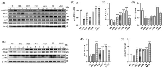Effect of MPGI on the AMPK/ACC/CPT and AMPK/ULK1/LC3B signaling pathways in the liver. The results of Western blot analysis of p-AMPK, AMPK, p-ACC, ACC, and CPT1A in mice livers (A). Digitalized results of the Western blot analysis (B–D). The Western blot analysis of p-ULK1, ULK1, and LC3B in mice livers (E). Digitalized results of Western blot analysis in E (F,G). ND group, 1–2 wells; HFD group, 3–4 wells; MET group, 5–6 wells; PSE group, 7–8 wells; GEN group, 9–10 wells; IQ group, 11–12 wells; MPGI group, 13–14 wells. Each sample is a mixture of three independent mouse livers for each group. The data are presented as mean ± SEM. #, ##, and ### indicate significant difference at p < 0.05, p < 0.01, and p < 0.001 compared with the ND group; *, ** and *** indicate significant difference at p < 0.05, p < 0.01, and p < 0.001 compared with the HFD group.
