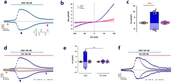 In Figure 1a, the blue circles represent the values of membrane current at +100 and −100 mV relative to the cell’s membrane area, which is referred to as the density of membrane current (dIm). As Figure 1a shows, perfusion with 100 nM GSK leads to a gradual increase in dIm at both +100 mV and −100 mV, peaking approximately 2 min after the addition of GSK. Subsequently, despite the continued presence of GSK in the extracellular medium, dIm gradually decreases.