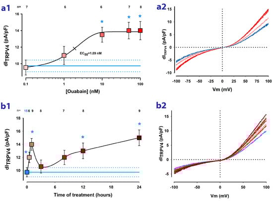 Ouabain affects the ion current density attributed to TRPV4 channels (dITRPV4). The graph in (a1) plots the relationship between the average value of dIm at +100 mV and the concentration of ouabain added to the culturing media for 1 h before the trials. Measurements of dITRPV4 were obtained from individual cells two minutes after the addition of GSK to the bathing media. Asterisks indicate a statistically significant difference between the average value of dITRPV4 with and without ouabain treatment. The blue lines represent the average value (±S.E.) of dITRPV4 obtained from cells not treated with ouabain. The numbers above each symbol indicate the number of trials. The graph in (a2) shows continuous traces of the current obtained in response to a ramp-shaped voltage stimulus for each of the ouabain concentrations depicted in (a1). The colors of the lines correspond to those of the symbols in (a1). The graph in (b1) describes the relationship between dITRPV4 and the duration of treatment (in hours) with ouabain 10 nM. The asterisks indicate a statistically significant difference (p < 0.05) between the average value of dI at a given treatment time and that obtained from untreated cells whose value is shown by the blue box and the horizontal blue line. The graph in (b2) shows continuous traces of the current obtained in response to a ramp-shaped voltage stimulus for each of the treatment times depicted in (b1). The colors of the traces correspond to those of the symbols in (b1).