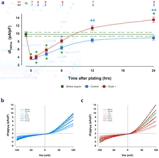Ouabain accelerates the recovery of dITRPV4 after the trypsinization and reseeding of MDCK cells. (a) Graph showing the relationship between the average value of dI and the time elapsed after reseeding, at confluence, of previously trypsinized cells. The blue squares represent the values obtained from cells not treated with ouabain 10 nM, while the red ones were obtained from cells to which ouabain was added from the moment of reseeding and remained present until the time of the recording. The green square and lines indicate the value obtained from cells in mature monolayers before trypsinization. Green asterisks denote a statistically significant difference (p < 0.05) between the value represented by the square and the corresponding value of the cells before trypsinization. Blue asterisks denote a statistically significant difference between the value of cells treated and not treated with ouabain at the same time after trypsinization. Numbers above the symbols indicate the number of repetitions of each experimental condition. (b) Superposition of representative traces of dITRPV4 obtained at each of the different times after trypsinization from cells under control conditions. (c) Superposition of representative traces of dITRPV4 obtained at each of the different times after trypsinization from cells treated with ouabain 10 nM.