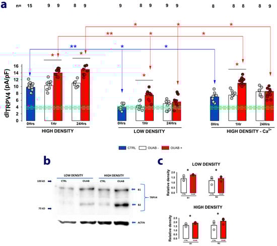 To strengthen the hypothesis that long-term treatment with ouabain promotes an increase in the expression of new TRPV4 channel units, we performed Western blot assays to quantify and compare the density of specific bands (revealed after probing with an anti-TRPV4 antibody) detected from lysate samples obtained either from cells assembled as a mature monolayer or from cells seeded at low density that therefore lacked cell–cell contacts. In both cases, cells were either treated or not with ouabain 10 nM for 24 h. As shown in the representative image in Figure 4b, a two-band pattern between 75 and 100 kD was obtained in all cases. In both cases, ouabain treatment induced a statistically significant increase in the density of both bands, as shown in the bar graphs in Figure 4c.