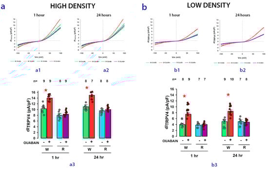 Figure 5 shows, in the form of bar graphs, the comparison of the results obtained for the average values of dITRPV4 in MDCK-W (abbreviated W) and MDCK-R cells (abbreviated R) seeded either at high density (panel a) or at low density (panel b). In each case, the effect of ouabain on dITRPV4 in the short (1 h) or long (24 h) term was statistically analyzed.