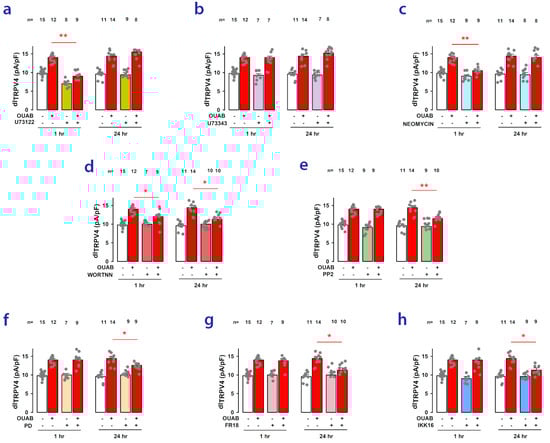 Involvement of signaling pathways in the modulatory effect of ouabain on dITRPV4. (a–h) Bar graphs comparing the mean (±S.E.) value of dITRPV4 in the presence or absence of different drugs inhibiting specific components of signaling pathways and/or in the presence or absence of ouabain, both at 1 and 24 h of treatment. In all graphs, the asterisks indicate that the presence of the given inhibitor produces a statistically significant reduction (*: p < 0.5 or **: p < 0.01) in the enhancement of dITRPV4 induced by ouabain. The numbers above the bars represent the number of repetitions for each experimental group. Dots represent the individual dITRPV4 values for each replicate in the experimental group.