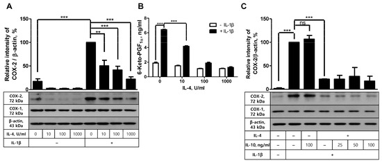 Next, to determine the role of Akt in the inhibition of COX-2 expression and PG production in FDC-like cells, we first examined the effect of IL-4 on IL-1β-driven COX-2 expression based on the previous activity of this cytokine. IL-4 exhibits inhibitory effects on COX-2 induction with LPS. Cells were pre-incubated with IL-4 for 24 h, followed by further culture in the presence or absence of IL-1β for 4 h. Even though graded doses of IL-4 alone did not significantly modulate COX-2 expression, they inhibited IL-1β-stimulated COX-2 expression in a dose-dependent manner. IL-4 exhibited an inhibitory effect from 10 U/mL concentration and gave rise to an 80% reduction in IL-1β-induced COX-2 expression at 1000 U/mL concentration (Figure 3A). This inhibitory effect of IL-4 was confirmed in the actual production of 6-keto-PGF1α. As shown in Figure 3B, the dose-dependent reduction in PG recapitulated that of COX-2 protein expression. For example, IL-4 treatment at 1000 U/mL resulted in an 80% reduction in 6-keto-PGF1α production. The effect of IL-4 on IL-1β-induced COX-2 expression seemed specific to this cytokine since IL-10, either alone or in combination with IL-4, did not further modulate COX-2 expression levels (Figure 3C). The inhibitory effect of IL-4 was specific to COX-2 and was not observed in the expression levels of COX-1.