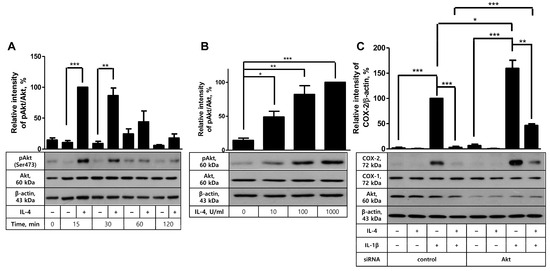 The suppressive effects of IL-4 on COX-2 induction and PG production. (A) FDC-like cells were pretreated with the indicated doses of IL-4 for 24 h, followed by further culture in the presence or absence of IL-1β for 4 h. The expression levels of COX-2 were measured with immunoblotting. (B) The culture of FDC-like cells was maintained for 24 h, followed by EIA with the supernatants to measure 6-keto-PGF1α. (C) FDC-like cells were pretreated with the indicated doses of IL-10 or IL-4 (100 U/mL) for 24 h, followed by further culture with IL-1β for 4 h. The expression levels of COX-2 were measured with immunoblotting. Representative immunoblots and statistical analysis data (mean ± SEM) from three independent experiments are shown. The successful knockdown of Akt was verified with immunoblotting. Statistical significance was analyzed with Student’s t-test by comparing the values with the control (** p < 0.01; *** p < 0.001; ns, nonsignificant).