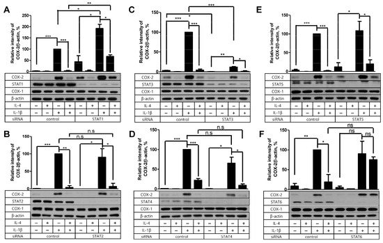 The effect of STAT protein knockdown on the suppressive activity of IL-4. (A–F) Indicated STAT proteins or control siRNA-transfected FDC-like cells were cultured in the presence or absence of IL-4 (100 U/mL) for 24 h and then with IL-1β (25 pg/mL) for 4 h. Expression levels of indicated proteins were measured with immunoblotting. Representative immunoblots and statistical analysis data (mean ± SEM) from three independent experiments are shown. The successful knockdown of Akt was verified with immunoblotting. Molecular weights of STATs: STAT1 (91 kDa), STAT2 (113 kDa), STAT3 (86 kDa), STAT4 (81 kDa), STAT5 (90 kDa), and STAT6 (110 kDa). Statistical significance was analyzed with Student’s t-test by comparing with the control (* p < 0.05; ** p < 0.01; *** p < 0.001; ns, nonsignificant).