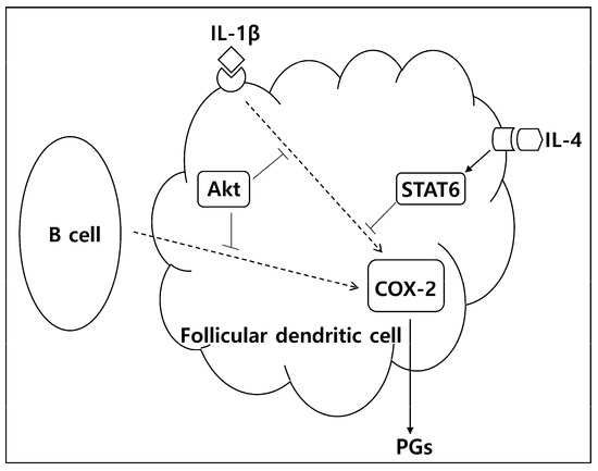 The investigation of IL-4 in this study was instigated by our finding of the inhibitory activity of IL-4 in COX-2 protein expression and PG production by FDC-like cells. The effect of IL-4 on IL-1β-induced COX-2 has not been examined before. Since PGs are critical mediators of inflammation [24,25,26], we aimed to understand the regulatory mechanisms of PG production in the immune inflammatory milieu. IL-4 exhibited the inhibitory effect on COX-2 expression induced by IL-1β in the current study. As IL-4 inhibits COX-2 expression induced by other stimuli, including LPS, TGF-β, TNF-α, and IFN-γ, as reported by ours previously [12], this cytokine appears to play inhibitory roles in COX-2 induction irrespective of stimulus types. As a potential intracellular molecule conveying IL-4 signal to COX-2 inhibition, we examined Akt and found a dispensable function of this protein. Although the incomplete suppression of COX-2 induction by IL-4 in Akt-knockdowned cells does not exclude the possibility of a partial contribution of Akt, we maintain that this failure of IL-4 may have been caused probably because the inhibitory effect of Akt on COX-2 induction was mitigated after siRNA transfection. Instead of Akt, STAT6 was required for IL-4 to exhibit inhibitory activity on COX-2 induction. IL-4 belongs to the hematopoietin cytokine family, where signal transduction is achieved via the STAT pathway [27,28]. The dependence of IL-4 on STAT6 is in line with our previous findings [12]. Supportive of our finding and implying a critical role for IL-4 in the GC, Duan et al. have recently demonstrated that IL-4 plays an important role in the regulation of FDC-B cell interactions in the GC [29].