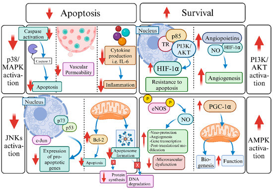 In addition, T3 facilitates the activation of pro-survival signaling pathways, which in turn are involved in the blockade of cellular apoptosis, as well as the stimulation of angiogenesis. The PI3K-Akt signaling cascade is a signal transduction pathway that enhances survival, angiogenesis, and regulated calcium cycling in cardiomyocytes. T3 may stimulate PI3K signaling by reinforcing the interaction of both TRα and TRβ with the PI3K regulatory subunit p85. Thus, T3 may promote cell survival and the better handling of calcium via Akt activation. Furthermore, enhanced PI3K/AKT/mTOR activity may result in the increased expression of the transcription factor HIF-1α [76,77]. Hypoxia-inducible factor 1α (HIF-1α) promotes cellular response to hypoxia, as well as resistance to apoptosis and the induction of angiogenesis [78]. Furthermore, the PI3K-Akt signaling pathway may ameliorate the expression of other angiogenic agents, such as angiopoietins and nitric oxide (NO). Experimental results support the crucial role of AMP-activated protein kinase (AMPK) in the improvement of left ventricular function, as well as the increase in myocardial tissue viability, following myocardial infarction. As shown, AMPK may augment the phosphorylation of eNOS, resulting in the enhanced bioavailability of nitric oxide (NO). As a result, vaso-protection, angiogenesis, gene transcription, and post-translational modification may be seen [79]. Moreover, AMPK promotes the stimulation of the transcriptional co-activator PGC-1α. PGC-1α promotes mitochondrial biogenesis and improves mitochondrial function in cardiomyocytes in response to conditions that require increased ATP production [80].