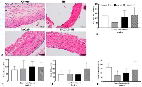 Morphological and mechanical alterations seen in the HS group may be the result of their combined involvement. In particular, PACAP can be released physiologically from nerve endings, but administration of the neuropeptide could modify these effects. After the follow-up, the HS was retained mostly in the PACAP-HS groups, where PACAP could have an impact on macrophages, influencing the healing of the vascular suture [,].