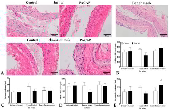 Representative histological photos (original magnification: 20×) and vessel wall layer thickness data of the in vitro cultured (14 days after tearing: intact or anastomosis; 14 days after harvesting from a rat: Control benchmark) arteries. (A) Representative H&E-stained slides; (B) full layer thickness; (C) tunica intima thickness; (D) tunica media thickness; and (E) tunica adventitia thickness. Means ± S.D., * p < 0.05 vs. Control.