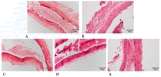 Representative orcein stained histological photos (original magnification: 20×) of the intact Control artery (A); anastomosed arteries in Control (B); HS (C); PACAP (D); and PACAP + HS (E) groups.