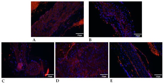 Representative pictures for elastin immunohistochemistry (original magnification: 40×) of intact Control artery (A); anastomosed arteries in Control (B); HS (C); PACAP (D); and PACAP + HS (E) groups. Blue: DAPI; Red: elastin antibody-positivity.