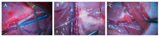 The surgical sites (between the two scapulae and on the right thigh) were shaved and disinfected with betadine, and an incision of about 4 cm was made in the right posterior inner thigh, below the level of the inguinal ligament and parallel to it. The underlying fatty tissue was cut parallel to the abdominal wall with scissors along the length of the incision and then pulled distally using a small hemostatic clamp. The fatty connective tissue around the artery was prepared, and the artery was isolated from the level of the inguinal ligament to the origin of the saphenous and popliteal arteries, separated from the femoral vein and nerves. A safety clip was placed on the artery under the inguinal ligament, followed by one jaw of the approximator, pulled to the lateral position, and the other jaw placed in front of the distal division of the femoral artery. Halfway between the two, the vessel was transected in a standardized manner. Washing with heparin (~0.4 mL, 2500 IU/mL) followed, and to inhibit absorption from the surgical site, we used gauze to absorb the excess and then washed the site of the invasion with physiological saline. The minimal amount of adventitia required for stitches was removed. Sutures were prepared using polyamide-6 monofilament (Daclon, SMI, Vith, Belgium) suture material containing a 10/0 serosa needle, and eight single-knot sutures were prepared in each case (Figure 7A). The patency of the anastomosis was checked in all cases with a “milking test” [].