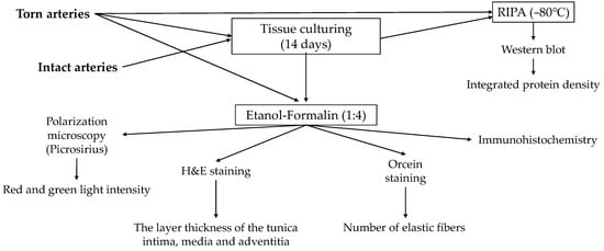 The vessel samples were prepared for the histological, cell culture and tensile-strength measurements and analyses, the protocol of which is summarized in Figure 8.