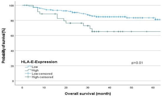 The Kaplan–Meier curve shows overall survival of OSCC patients depending on HLA-E expression. Patients with high HLA-E expression in primary tumors showed worse overall survival (Log-Rank test, p = 0.01).