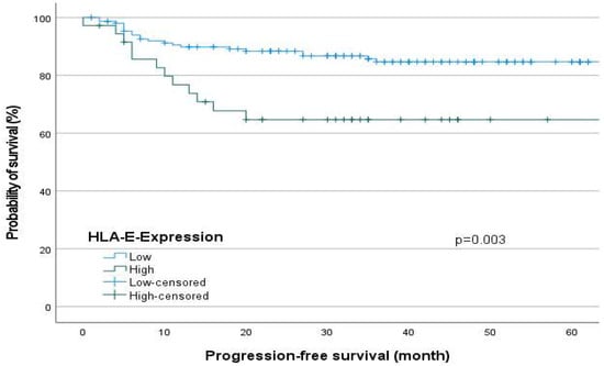 The Kaplan–Meier curve shows progression-free survival of OSCC patients depending on HLA-E expression. Patients with high HLA-E expression in primary tumors showed worse progression-free survival (Log-Rank test, p = 0.003).