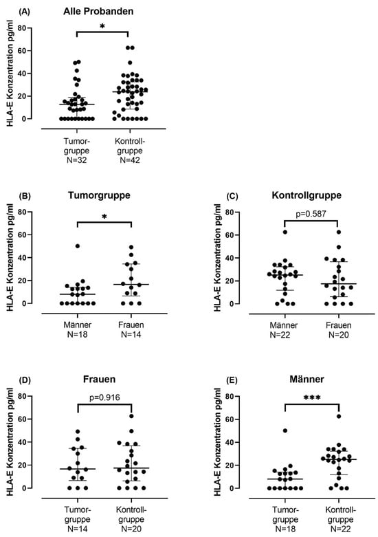 In a further step, the sHLA-E concentration of the tumor group was compared with the sHLA-E concentration of the control group, for which another Mann–Whitney U-test was performed (Supplementary Table S7, Figure 3A). The test showed that the sHLA-E concentration in the control group was significantly higher than the sHLA-E concentrations of the tumor group (N = 74, U = 461, W = 989, p = 0.021). A closer look reveals that there is a gender difference in sHLA-E concentration between males and females: While in men a significantly lower sHLA-E concentration is detectable in the serum of the tumor group than in the control group (Mann–Whitney U-test: N = 40, U = 312.5, W = 565.5, p = 0.001) (Supplementary Table S8, Figure 3E), in women no difference in sHLA-E concentration between tumor and control group could be detected (Mann–Whitney U-test: N = 34, U = 134, W = 353, p = 0.916) (Supplementary Table S9, Figure 3D).