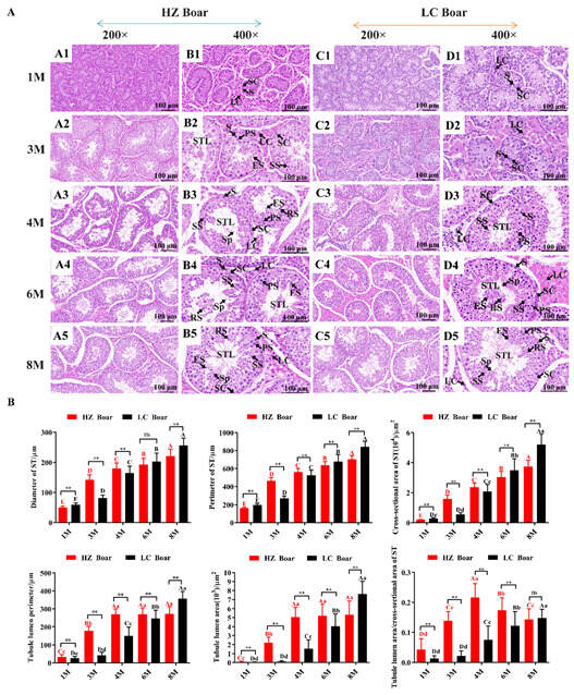 Morphological comparisons of testicular tissues in the HZ and LC boars at different development stages. (A) The representative photographs from 1 M, 3 M, 4 M, 6 M, and 8 M testicular cross-sections of HZ and LC boars at 200× and 400× magnification, respectively. (B) Morphological parameter values derived from testicular tissue of different age groups. (A1–A5) are representative photographs of 1 M, 3 M, 4 M, 6 M, and 8 M testis cross-sections of HZ boars at 200× magnification, respectively; (B1–B5) are representative photographs of 1 M, 3 M, 4 M, 6 M, and 8 M testis cross-sections of HZ boars at 400× magnification, respectively; (C1–C5) are representative photographs of 1 M, 3 M, 4 M, 6 M, and 8 M testis cross-sections of LC boars at 200× magnification, respectively; (D1–D5) are representative photographs of 1 M, 3 M, 4 M, 6 M, and 8 M testis cross-sections of LC boars at 400× magnification, respectively. S—spermatogonia; LC—Leydig cell; SC—Sertoli cell; STL—seminiferous tubule lumen; PS—primary spermatocyte; SS—secondary spermatocyte; RS—round spermatid; ES—elongated spermatid; Sp—spermatozoa. Data were presented as mean ± SD in the graphs. Different capital and lower letters represent extremely significant differences (p < 0.01) and significant differences (p < 0.05) between groups, respectively. Red letters denote comparisons between HZ boar groups, while black letters denote comparisons between LC boar groups. **: p < 0.01, and ns (no significance): p > 0.05. 1 M—1 month old; 3 M—3 months old; 4 M—4 months old; 6 M—6 months old; 8 M—8 months old.