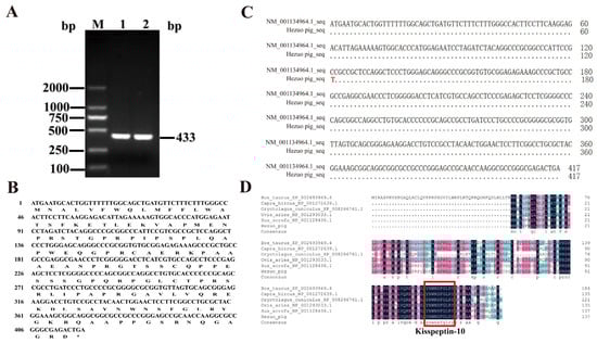 The RT-PCR amplification product of the Kiss1 gene from HZ boars was detected by 1.5% agarose gel electrophoresis, obtaining a specific band of approximately 433 bp (Figure 2A), which was consistent with the expected target fragment. The cloned Kiss1 cDNA sequence included 417 bp, encoding 138 amino acids (Figure 2B). Compared to the porcine reference sequence (Accession No. NM_001134964.1), there is a base mutation (C → T) in the CDS sequence of the cloned HZ porcine Kiss1 gene at nucleotide position 121, resulting in a proline mutation to a serine (Figure 2C). Amino acid sequence comparison showed that HZ boars Kiss1 amino acid sequence displayed 99.28% sequence similarity with pig, 51.34% with cattle, 69.57% with goat, 67.39% with sheep, and 52.17% with rabbit Kiss1 (Figure 2D). Interestingly, kisspeptin is highly conserved in the kisspeptin-10 region across species.
