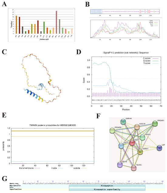 Bioinformatics analysis of HZ boar Kiss1 protein. (A) Analysis of the amino acid composition of HZ boars Kiss1 protein. (B) The secondary (C) and tertiary structure prediction of the HZ boars Kiss1 protein. (D) Signal peptide (E) and transmembrane structure prediction of the HZ boars Kiss1 protein. (F) Analysis of protein networks interacting with HZ boars Kiss1 protein. Network nodes represent the proteins encoded by the genes and edges represent protein–protein associations. (G) Conserved domain prediction of the HZ boars Kiss1 protein.