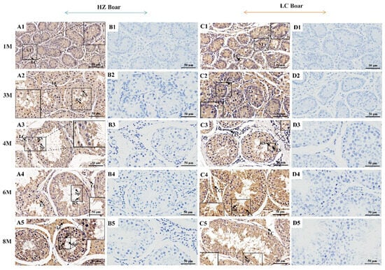 Immunohistochemical staining of Kiss1 protein in testes of HZ and LC boars at different developmental stages. (A1–A5) Immunostaining patterns of Kiss1 protein in the 1 M, 3 M, 4 M, 6 M, and 8 M HZ boar testes, respectively (400×); (B1–B5) Replace primary antibody with PBS as HZ boar testes negative control (400×); (C1–C5) Immunostaining patterns of Kiss1 protein in the 1 M, 3 M, 4 M, 6 M, and 8 M LC boar testes, respectively (400×); (D1–D5) Replace primary antibody with PBS as LC boar testes negative control (400×). LC—Leydig cell; RS—round spermatid; ES—elongated spermatid; Sp—spermatozoa, ST—seminiferous tubule. 1 M—1 month old; 3 M—3 months old; 4 M—4 months old; 6 M—6 months old; 8 M—8 months old.
