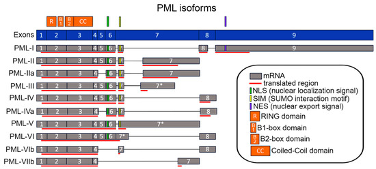 Thirty years of intensive research on PML in numerous laboratories worldwide have revealed that PML is a multifunctional protein that plays a key role in both physiological and pathological cellular processes. These processes include tumor suppression or oncogene function depending on tumor context, DNA damage response, cell migration, epigenetic composition of chromatin, apoptosis, senescence, neoangiogenesis, antiviral defense, and hematopoietic stem cell maintenance [4,5,6,7,8]. Several comprehensive review articles have focused on the roles of PML isoforms in protein–protein interactions [2,9,10,11,12,13], as well as in infectious diseases [14,15,16].