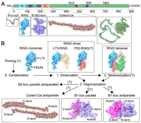 Known structural models based on crystallographic studies and AlphaFold2 prediction (AF-P29590-F1)—Panel (A). Proposed pathways of PML protein oligomerization—Panel (B). Structures depicted using UCSF ChimeraX [63]: RING monomers, dimers, and tetramers (5YUF.pdb); B1-box antiparallel dimer (6IMQ.pdb); B1-box parallel dimer (2MVW.pdb). The arrows indicate potential pathways of PML oligomerization.