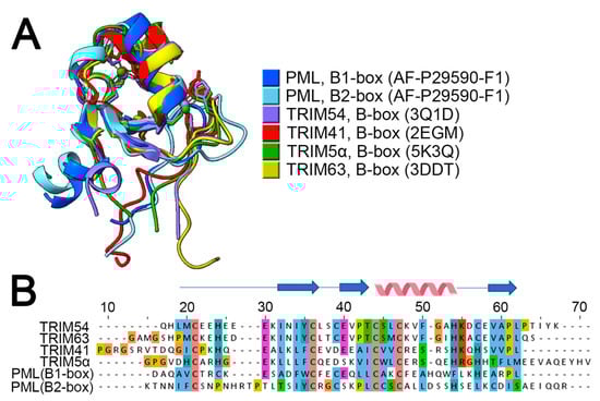 Comparison of TRIM family B-box domains. Panel (A)—Overlay of PML B1- and B2-box domain structures (blue, cyan—AlphaFold2 prediction) and crystal structures of B-box domains: TRIM63 (3DDT.pdb), TRIM5α (5K3Q.pdb), TRIM41 (2EGM.pdb), and TRIM54 (3Q1D.pdb). Panel (B)—Sequence alignment of B-box domains, with β-sheets and α-helices displayed on top. Colors correspond to the default Clustal color scheme. Structure comparison was performed using ChimeraX, sequence alignment was performed using ClustalW [71], and visualization was conducted using Jalview [72].