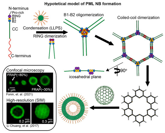 Hypothetical model of PML body formation. Shown are the stages of PML protein maturation through liquid–liquid phase separation (LLPS), followed by RING, B1–B2 box domain (B1, B2) dimerization, and coiled-coil (CC) domain dimerization to form the hexameric structure. Confocal microscopy data from our group’s studies [22,60] are presented. It is shown that smaller PML bodies exchange their components with the nucleoplasm more rapidly (as evidenced by fluorescence recovery after photobleaching (FRAP) recovery rate of ~80%), while larger, ‘mature’ PML bodies exchange more slowly (FRAP recovery of about ~30%). Super-resolution SIM microscopy data are taken from an open research article by Li Chuang and colleagues [59].