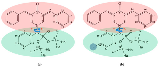 Molecular structure of compound 1 (a) and compound 2 (b) with designation of dihedral angles τ1 (C6-N1-C7-C8) and τ2 (C2-N1-C7-P1) (blue arrows) and corresponding fragments—structures of 3,5-dibenzylidene-4-oxopiperidine (red region) and diethyl(phenyl)methylphosphonate (green region). Atoms numbering is used to label signals and cross-peaks in NMR spectra and designate dihedral angles.