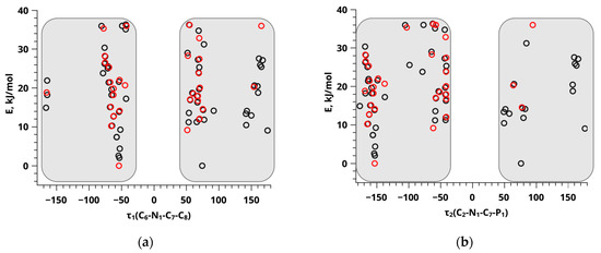 Nonetheless, alterations in these angles are constrained to such an extent that they fall below the detectable threshold attainable through the employed NOESY techniques. The angle τ1 (C6-N1-C7-C8) values for compound 1 and compound 2 are highly similar. In Figure 2a, the black dots correspond to the conformers of compound 1, while the red dots represent the conformers of compound 2. It is observed that, in the majority of situations, both the energy and angle values are identical. The primary deviations from this pattern can be attributed to the limited number of computed conformers with energies below 36.35 kJ/mol for compound 2 (only 39 structures), compared to the more extensive set of 62 structures obtained for compound 1. Figure 2a displays graphs that reveal the presence of two distinct groups of conformers. These groups may be identified based on their angle values, which range from −55° to −150° and from 60° to 150°. Figure 2b demonstrates a comparable pattern at the angle τ2 (C2-N1-C7-P1).
