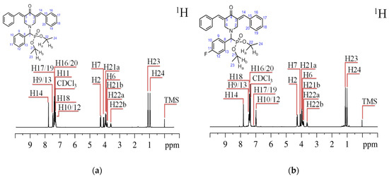 Upon analyzing the chemical shifts of NMR signals in the 1H spectra, it was seen that there are two signals in the high field region corresponding to the methyl groups of diethyl(phenyl)methylphosphonate (H23 and H24) [35]. Within the frequency range of 3 to 5 ppm, there are a total of seven NMR signals associated with the CH2 groups of the diethyl(phenyl)methylphosphonate (H21a, H21b, H22a, and H22b) and oxypiperidine (H2 and H6) fragments [36,37]. Additionally, there is a signal for the CH group (H7) bonded to the nitrogen atom of piperidine. The region between 6 and 8 ppm exhibits NMR signals corresponding to the hydrogen atoms of the phenyl (H10/12, H9/13; H11—for compound 1) and dibenzalidene (H14, H16/20, H17/19, and H18) fragments of the molecules [38].