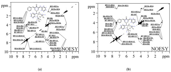 In our current investigation concerning compound 1 and compound 2, we adopted a similar approach, as proposed by the authors of [48], but with a modification. Instead of relying on normalized integral intensities, we employed cross-relaxation rates. This adaptation is deemed more appropriate, as cross-relaxation rates offer a direct correlation with both internuclear distances (as described in Equation (1)) and the conformation of molecules in solution (as illustrated in Equation (2)), as evidenced in the work of Lee and Krishna [49].