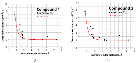 The data on internuclear distances and cross-relaxation rates were used to establish the relationship shown in Figure 5. Equivalent graphs were obtained for every conformer of compound 1 (refer to Table S11) and compound 2 (refer to Table S12). The data acquired from the graph were approximated using the reference-free model described [48].