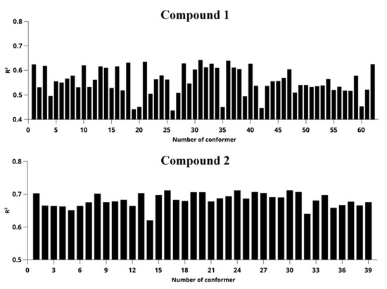 The determination coefficients resulting from the data analysis of individual conformers of the studied objects are graphically presented in Figure 6. Figure 6 illustrates that discerning a predominant conformation is challenging due to the closely comparable determination coefficients among multiple conformers. This proximity in coefficient values can be attributed to the substantial conformational flexibility inherent to the molecules under investigation.