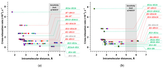 It is worth noting that a third category of distances, which surpasses 5 Å, is depicted in gray and has been deemed unsuitable for determining the proportions of conformer groups for the subjects under investigation in this study. Furthermore, it is essential to highlight that, for clarity, Figure 7 does not encompass all computed distances but only presents a representative selection. Consequently, distances such as H9/13–H24, H9/13–H23, and H16/20–H23 are omitted from Figure 7. This omission is justified as the positions of these distances substantially overlap with most data points corresponding to distances characterized by low cross-relaxation rates, which would impede the visualization and interpretation of results.
