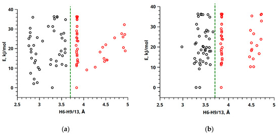 Energy values of different conformers A (black dots) and B (red dots) versus distances H6/H9–H13 for compound 1 (a) and compound 2 (b) obtained using the B3LYP method in conjunction with the 6-31G and CC-pVTZ basis sets. In this context, utilizing the green line serves the purpose of visually demarcating distinct groups of conformers.