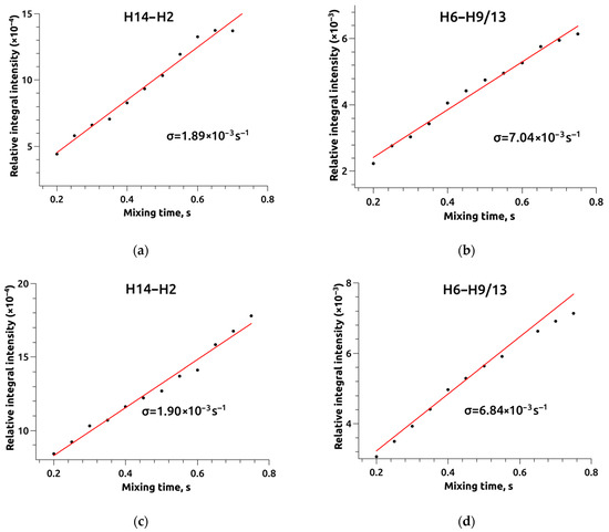 The cross-relaxation rates for the experimentally determined and reference distances were previously computed utilizing the IRA. These rates were found to be 1.89 ± 0.08 × 10−3 s−1 and 7.04 ± 0.25 × 10−3 s−1 for the H14–H2 and H6–H9 distances in the structure of compound 1. Similarly, for compound 2, the corresponding rates were 1.90 ± 0.04 × 10−3 s−1 and 6.84 ± 0.23 × 10−3 s−1 for the same H14–H2 and H6–H9 distances (refer to Figure 9).