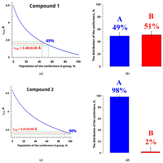 In the context of a two-position exchange (A) ↔ (B), this relationship follows a relatively simple form (Figure 10a,c), represented by a nonlinear curve rexp = f(PA) (Equation (8)). The experimental distance value (red line) and its associated error range (green lines) are marked along the ordinate axis. The projection of these values onto the curve rexp = f(PA) allows for the determination of the proportion of conformer group A, along with its corresponding error range, for both compound 1 (Figure 10a) and compound 2 (Figure 10c).
