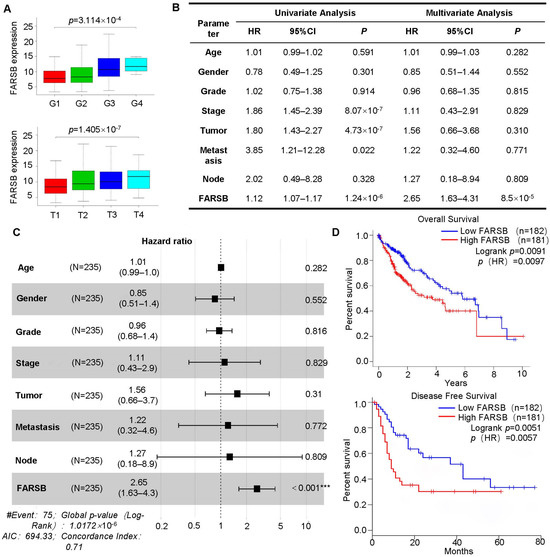 A high expression of FARSB is associated with a poor prognosis of patients. (A) The correlation between FARSB mRNA level, tumor grade and TMN stage in the TCGA-LIHC dataset. In the (B,C) TCGA-LIHC dataset, Cox regression analysis was performed on the clinical correlation data, and the forest plot was drawn with the data in the table (n = 235). (D) The TCGA-LIHC dataset was used for patient survival analysis, including overall survival and disease-free survival. ***: p < 0.001.